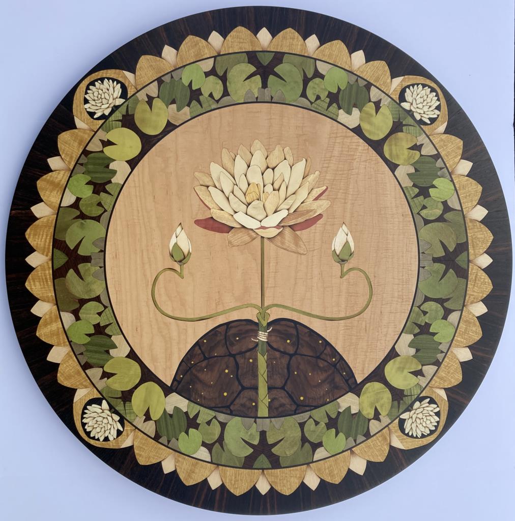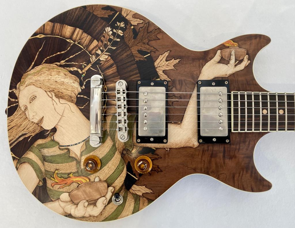 James Macdonald is spending his life in play clothes, happily creating in wood. He began professionally in 1981 and now makes electric guitars which feature quite remarkable marquetry and inlay. His instruments are finely crafted with traditional woods using Gibson style construction. He considers his marquetry designs to be a form of storytelling. Wood veneers from around the world are hand cut then detailed with a woodburning pen. Collaborations and custom designs are always welcome. Clients have included the Gibson Custom Shop, Petros Guitars, and Hinckley Yachts. His goal is to make guitars that look, sound, and play great. Macdonald accepts commissions for guitars, furniture, portraits, and artwork featuring marquetry.